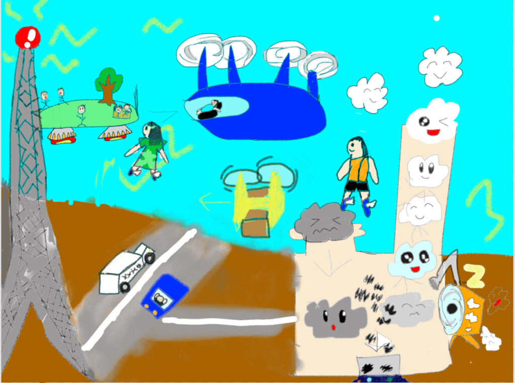 空を歩けたり、自動で目的地まで送ってくれたりしてくれたりしたら良いなと思ったから。公園が空に浮いていたら面白いなと思って空に浮く公園を描いたり、